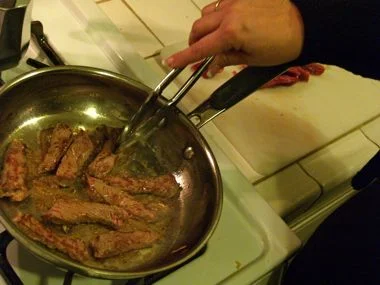 3) In the same skillet, over high heat, sear the steak strips until brown. About one minute per side. NOTE: Do not stir the meat. You want it brown. Use tongs or a fork to flip.